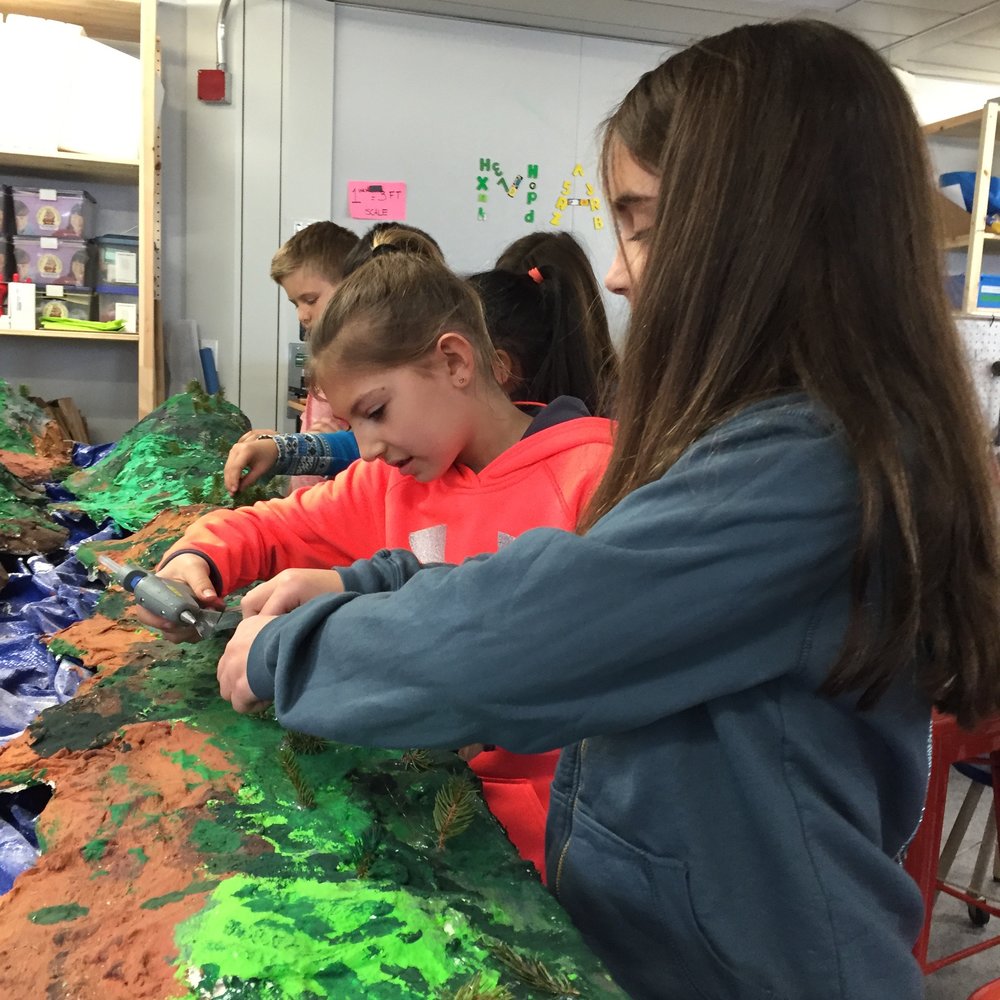 Students from all of the 3rd grade classes participated in building the structure of the model. Students helped to create the river bed, assembling the frame, laying down tarp for the lining and learning to use simple hand tools such as saws and hammers to cut and attach wood blocks. After finishing the frame, students learned about scale, elevation and topography. They applied this knowledge to the task of creating the geographical features of the Upper Hudson, such as Mt. Marcy, Lake Tear-in-the-Clouds and other portions of the Adirondacks.